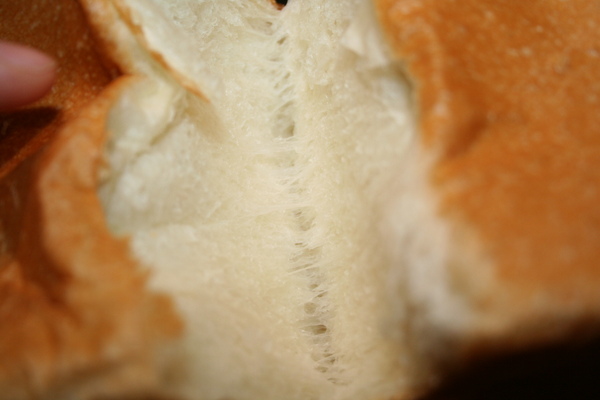 第十六、敲擊後取出吐司 第二、外型還可以,好像烤爐溫度開太高了,顏色有點深,外皮有碎裂現象。